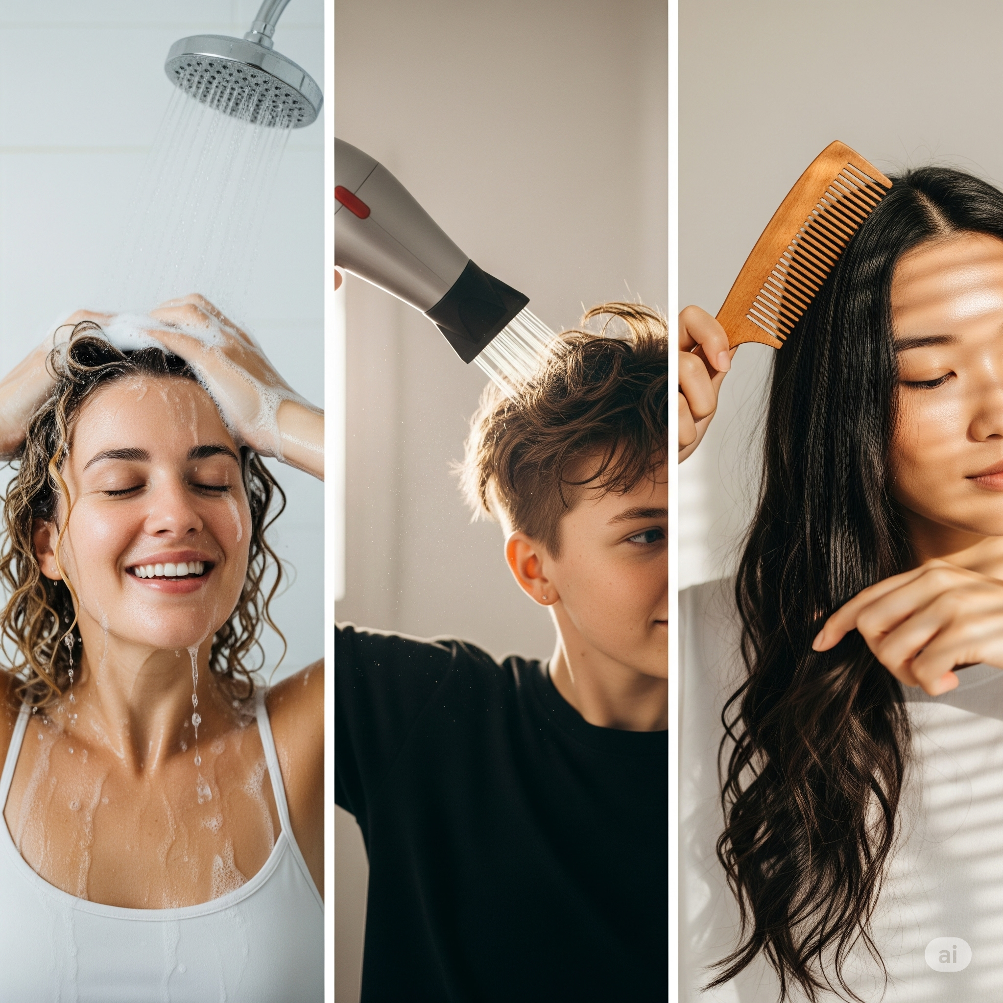 순하고 자신에게 맞는 샴푸를 사용하고, 미온수로 충분히 헹궈냅니다.