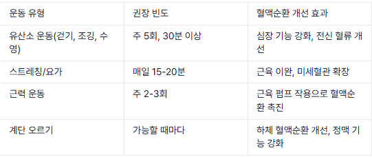 효과적인 혈액순환 개선을 위해서는 규칙적인 운동이 필수적입니다. 유산소 운동은 심장 기능을 강화하고 혈액순환을 촉진하는 데 탁월합니다. 주 150분 이상의 달리기, 수영, 사이클링과 같은 유산소 운동을 실천해 보세요.