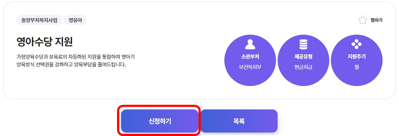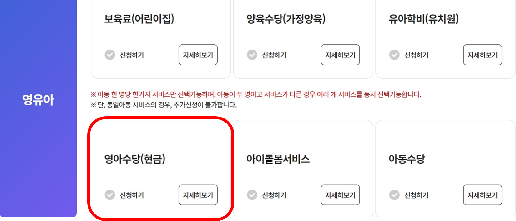 2. 영유아 항목 내 영아수당(현금) 클릭